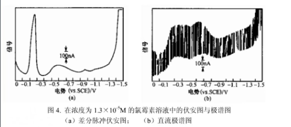 總之,DPV由于降低了背景電流而具有更高的檢測(cè)靈敏度和更低的檢出限,使其能夠應(yīng)用于濃度低至約10mol/L(1ug/L)的場(chǎng)合。圖4是差分脈沖伏安法的檢測(cè)能力與直流極譜法的對(duì)比。