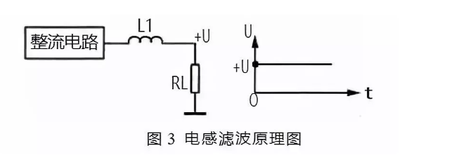 圖 3 所示是電感濾波原理圖。由于電感 L1 對直流電相當(dāng)于通路,這樣整流電路輸出的直流電壓直接加到負(fù)載 RL 上。