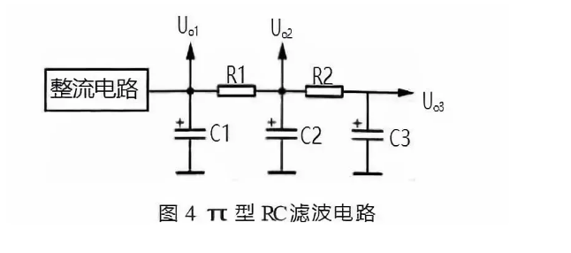 圖 4 所示是 π 型 RC 濾波電路。電路中的 C1、C2 和 C3 是 3 只濾波電容,R1 和 R2 是濾波電阻,C1、R1 和C2 構(gòu)成第一節(jié) π 型的 RC 濾波電路, C2、R2 和 C3 構(gòu)成 第二節(jié) π 型 RC 濾波電路。由于這種濾波電路的形式如同希臘字母 π 和采用了電阻器、電容器,所以稱為 π 型 RC 濾波電路。