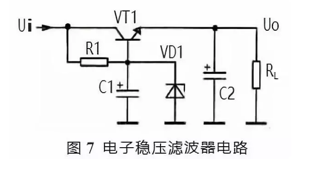 圖 7 所示是另一種電子穩(wěn)壓濾波器,與前一種電路相比,在 VT1 基極與地端之間接入了穩(wěn)壓二極管 VD1。電子穩(wěn)壓原理如下: