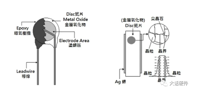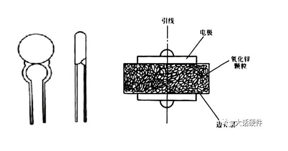 從上面的示意圖中可以看出,壓敏電阻主要有5個(gè)部件組成:絕緣層,本體,導(dǎo)電銀漿,連接條,引腳。