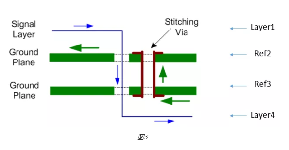 一般而言,因?yàn)闃?biāo)準(zhǔn) PCB 的 DRC 檢查只會(huì)檢查鼠線有沒(méi)接完和安全間距夠不夠這兩種狀況,所以像 ReturnPath 這樣的分析就較不易實(shí)現(xiàn),往往需有經(jīng)驗(yàn)的老手開(kāi)啟相關(guān)的圖層跟著看高速信號(hào)走線的相鄰層來(lái)確?;亓髀窂?,管控 Layout 質(zhì)量。亦或?qū)?Layout 訂立一些走線旁該怎么加 StitchingVia 的規(guī)范,STItchingVia 的示意如下圖(三),至于差動(dòng)信號(hào)打 Via 后旁邊要拱幾個(gè) STItchingVia,那又是另外的故事了!