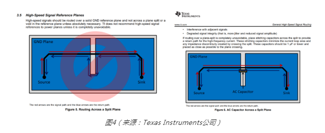甚或是最后不得已需添加縫補(bǔ)電容以填補(bǔ)那些跨不過(guò)壕溝(Moat),而導(dǎo)致成本增加以完善回流路徑,如下圖(四)TI 規(guī)范中的例子。