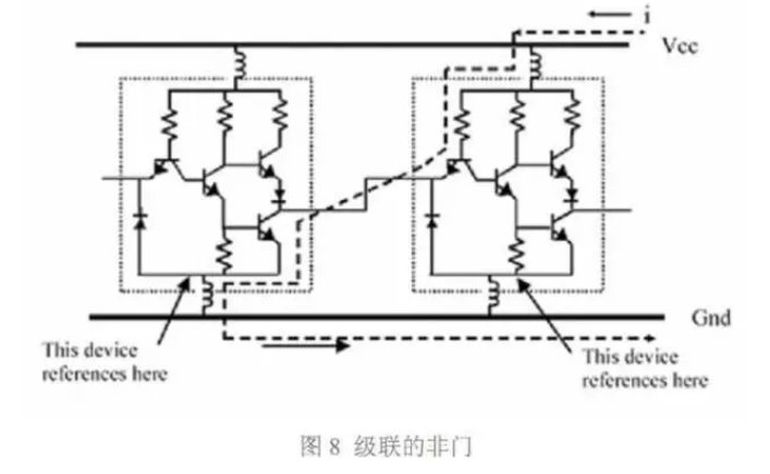 實際電路設計中,器件之間相互連接構(gòu)成完整系統(tǒng),因此器件之間必然存在相互影響。作為例子,我們級聯(lián)兩個非門,如圖 8 所示,看看兩個器件之間怎樣相互影響。理想的情 況應該是:第一個非門輸入邏輯低電平(邏輯 0) ,其輸出為高電平,第二個非門輸入為 第一個的輸出,也為高電平,因此第二個非門輸出低電平。