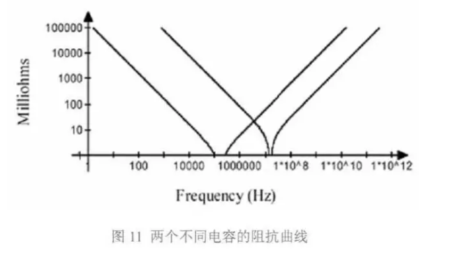 容值不同的電容具有不同的諧振點。圖 11 畫出了兩個電容阻抗隨頻率變化的曲線。