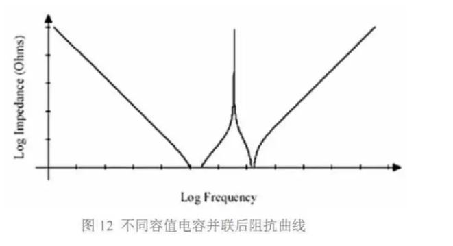 兩個容值不同的電容并聯(lián)后, 阻抗曲線如圖 12 所示。從圖 12 中我們可以得出兩個結(jié)論: