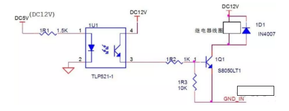 NPN晶體管驅(qū)動時:當(dāng)晶體管T1基極被輸入高電平時,晶體管飽和導(dǎo)通,集電極變?yōu)榈碗娖?,因此繼電器線圈通電,觸點(diǎn)RL1吸合。