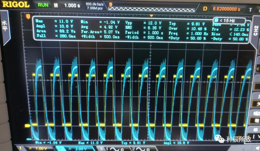 如果 PWM 的頻率比較低會怎樣,比如,我 PWM 周期為 1HZ,然后占空比設置為50% ,直接給大家看一個圖:
