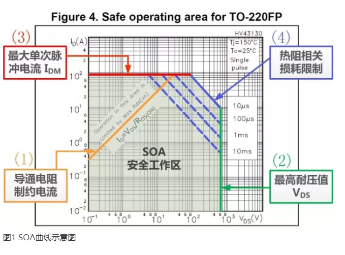 SOA(Safe operating area)是指安全工作區(qū),由一系列限制條件組成的一個(gè)漏源極電壓VDS和漏極電流ID的二維坐標(biāo)圖,開(kāi)關(guān)器件正常工作時(shí)的電壓和電流都不應(yīng)該超過(guò)該限定范圍。