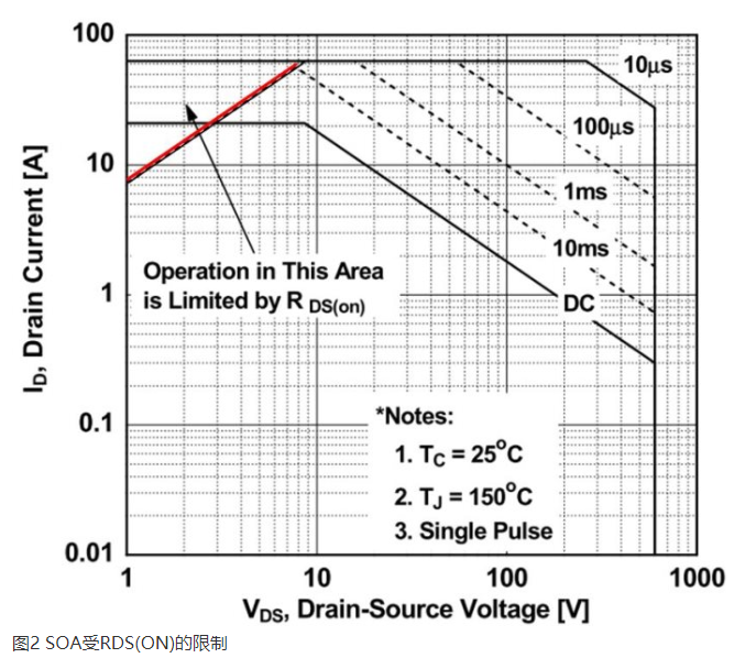 1、安全工作區(qū)SOA曲線(xiàn)左上方的邊界斜線(xiàn),受功率MOSFET的導(dǎo)通電阻RDS(ON)限制。