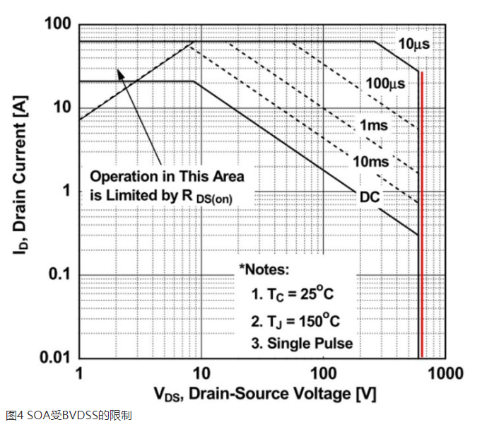 2、安全工作區(qū)SOA曲線(xiàn)最右邊的垂直邊界,是受最大的漏源極電壓BVDSS的限制,即漏源擊穿電壓。