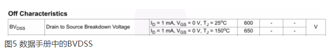 漏源擊穿電壓BVDSS是功率MOSFET數(shù)據(jù)表中所標(biāo)稱(chēng)的最小值。如下圖所示: