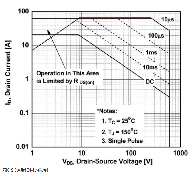 3、安全工作區(qū)SOA曲線(xiàn)最上面水平線(xiàn),受最大的脈沖漏極電流IDM(或連續(xù)漏極電注ID)的限制。