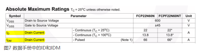 有些SOA曲線(xiàn)會(huì)分別標(biāo)注DC和脈沖模式下的曲線(xiàn),需要注意的是IDM是脈沖工作狀態(tài)的最大電流,通常最大漏極脈沖電流IDM為連續(xù)漏極電流ID的3到4倍,因此脈沖電流要遠(yuǎn)高于連續(xù)的直流電流。IDM和ID在數(shù)據(jù)手冊(cè)中的定義如下: