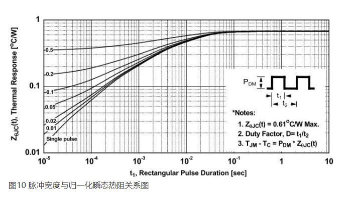 其中Tjmax為最大結(jié)溫,TC為殼溫,ZθJC為歸一化瞬態(tài)熱阻系數(shù),RθJC為穩(wěn)態(tài)熱阻。ZθJC可以在MOSFET的數(shù)據(jù)手冊(cè)中的脈沖寬度與ZθJC的曲線(xiàn)圖中查到,因此可以通過(guò)脈沖寬度來(lái)計(jì)算出PDM。