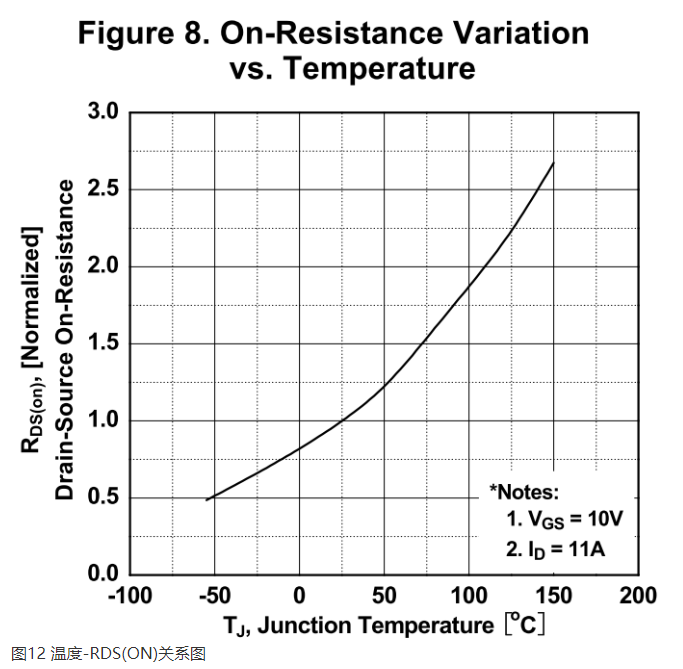 例如,在不同的工作溫度、不同的脈沖電流或脈沖寬度條件下,RDS(ON)的值都會(huì)不同。在功率MOSFET的數(shù)據(jù)手冊(cè)中通常都提供了溫度-RDS(ON)的特征曲線(xiàn)圖,如下圖所示: