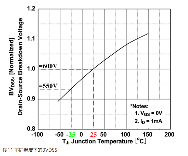 例如,一款MOS管的BVDSS為600V,但這個(gè)600V是在25℃的值,如果工作在-25℃時(shí),則BVDSS可能只有550V。如下圖所示: