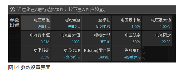 我們來(lái)設(shè)置示波器的SOA參數(shù),BVDSS對(duì)應(yīng)于“電壓限定值”,ID對(duì)應(yīng)于“電流限定值”,PD對(duì)應(yīng)于“功率限定值”,RDS(ON)對(duì)應(yīng)于“Rds(on)限定值”,同時(shí)設(shè)置合適的電壓電流坐標(biāo)范圍(即電壓電流最大值和最小值),參數(shù)設(shè)置界面如下圖所示: