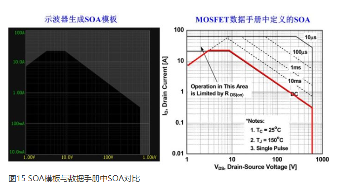示波器生成的SOA模板,可以與MOSFET數(shù)據(jù)手冊(cè)中的相應(yīng)條件的SOA進(jìn)行對(duì)比,如下圖所示。當(dāng)然在實(shí)際使用中,還是需要根據(jù)當(dāng)前環(huán)境和工作條件對(duì)SOA限定區(qū)域條件進(jìn)行降額和修正。