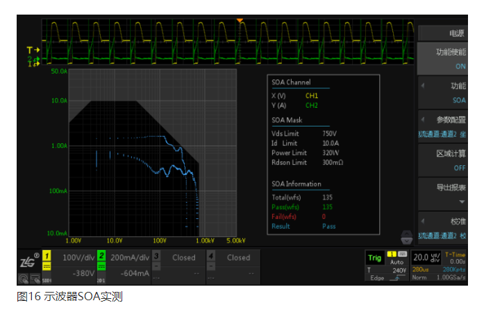 示波器的SOA測(cè)試應(yīng)用非常簡(jiǎn)單,使用電壓、電流探頭正常測(cè)試開(kāi)關(guān)管的VDS和IDM,打開(kāi)SOA分析功能,對(duì)照數(shù)據(jù)手冊(cè)的SOA數(shù)據(jù)設(shè)置好示波器的SOA參數(shù)即可。