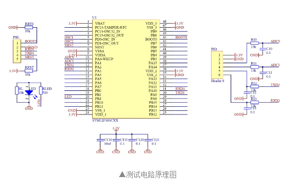 設(shè)計基于STM32F103的測試電路板。這顆芯片我手邊有很多,所以選擇它進(jìn)行實驗。利用它的 串口2 進(jìn)行測試。串口1用于程序的下載。使用RC低通濾波器對 TXD2信號進(jìn)行濾波。實際上 RXD2 是沒有使用的。另外,還將兩路ADC引導(dǎo)端口。這樣,可以利用ADC對外邊送入的信號進(jìn)行采集之后,再從 TXD2 送出,驗證一下對音頻信號的采集與合成的功能。布置單面測試電路板。其中包括一個飛線,使用 0 歐姆電阻進(jìn)行跳線。