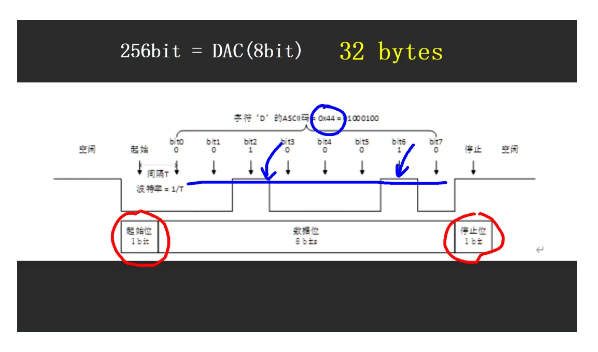 單片機(jī)的串口發(fā)送一個字節(jié)的信號波形中,包括一個bit 的起始位,一個bit 的停止位。它們分別是0 和 1,這是無法改變的。中間八個bit的數(shù)據(jù)位是可以改變的。比如發(fā)送0x44,其中就會包含有兩位高電平。這樣就有了8個可以被控制的高低電平的數(shù)據(jù)位。那么這就可以實現(xiàn) 3bit 位的 DAC輸出了。如果想實現(xiàn) 8bit 的 DAC輸出。則需要 256個可以被控制的數(shù)據(jù)位。這樣只要將連續(xù)32個發(fā)送字節(jié)合在一起,變可以形成256位可以控制高低電平的信號波形。從而實現(xiàn) 8bit 的 DAC 輸出了。下面通過單片機(jī)測試一下這種串口輸出模擬量的性能。