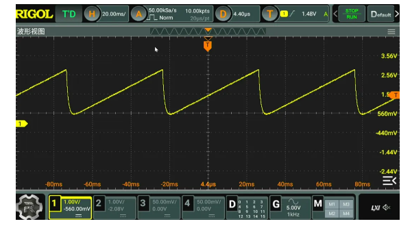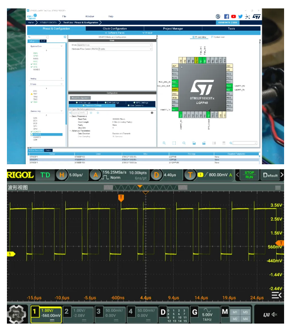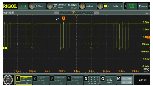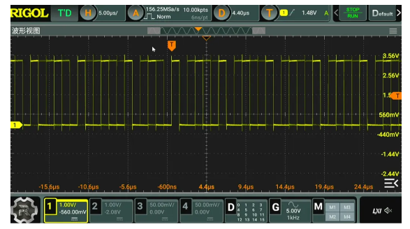 設(shè)置單片機(jī)的 UART2 的基本參數(shù)。輸出波特率為 1MHz。這樣可以提高輸出信號的更新率。通過示波器可以測量到輸出信號 每一位的時間 為1微秒,對應(yīng) 1MHz的波特率。啟動DMA輸出模式,UART2 便可以通過DMA持續(xù)發(fā)送內(nèi)存中 32 個字節(jié)內(nèi)容。