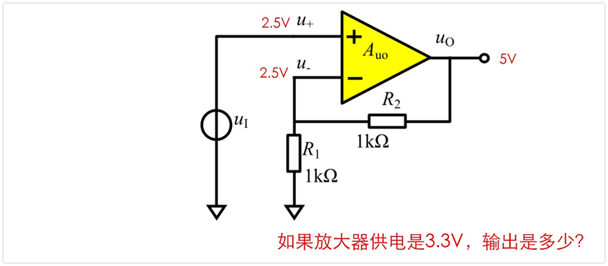 顯然,輸出超不過5V,此時(shí)放大器工作在飽和區(qū),頂天了放大器也只能放大到3.3V,因此輸出最終達(dá)不到5V,那么u-自然也到不了2.5V了,此時(shí)u+也就不等于u-了,也就不滿足虛短了。
