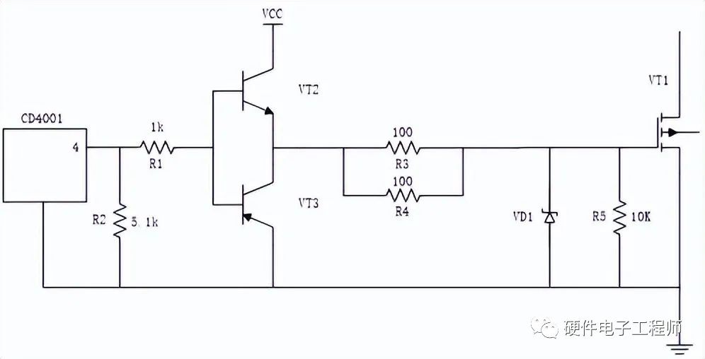 圖7中雖然通過增加二極管減少驅(qū)動(dòng)電路的阻抗,但二極管、三極管導(dǎo)通壓降以及導(dǎo)通電阻還是存在的,回路阻抗減小有一定的限度。如下圖8中VT4管的存在是增加了MOS管柵極到低電平的回路,VT4可以選擇三極管,但三極管的導(dǎo)通需要基極偏置,三極管不能工作完全飽和狀態(tài),抽取電荷的能力也是有限的??梢赃x擇小容量MOS管來代替三極管,但這個(gè)MOS管需要一個(gè)電平的轉(zhuǎn)換以使和實(shí)際驅(qū)動(dòng)信號(hào)的相位相反。由于MOS管是電壓驅(qū)動(dòng),并能夠運(yùn)行在飽和導(dǎo)通狀態(tài),把功率MOS管的電荷迅速抽走,如下圖9所示。