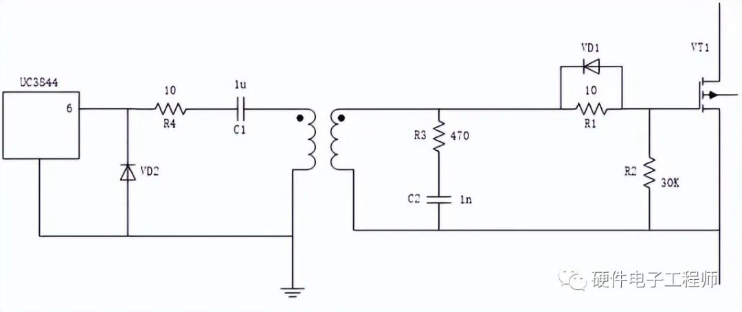 圖4是一個(gè)采用正激隔離變壓器實(shí)現(xiàn)電氣隔離的驅(qū)動(dòng)電路??刂菩酒捎昧薝C3844,其輸出為高電平時(shí),輸出電流經(jīng)過R4、C1給變壓器初級(jí)線圈勵(lì)磁。次級(jí)線圈為高電平輸出,通過驅(qū)動(dòng)電阻R1來驅(qū)動(dòng)MOS管導(dǎo)通。