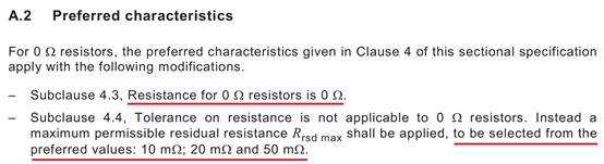 針對這兩個(gè)問題,我專門查了一下電阻的標(biāo)準(zhǔn)。根據(jù)EN60115-2電阻標(biāo)準(zhǔn)文件記載,0Ω電阻的阻值是0Ω,但也會有偏差。0Ω最大電阻偏差有三種可以選擇,分別為10mΩ、20mΩ和50mΩ。