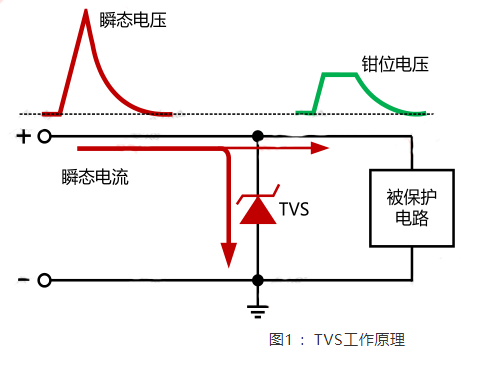 TVS(Transient Voltage Suppressors),即瞬態(tài)電壓抑制器,又稱雪崩擊穿二極管。它是采用半導(dǎo)體工藝制成的單個 PN 結(jié)或多個 PN 結(jié)集成的器件。TVS 有單向與雙向之分,單向 TVS 一般應(yīng)用于直流供電電路,雙向 TVS 應(yīng)用于電壓交變的電路。如圖 1 所示,應(yīng)用于直流電路時單向 TVS 反向并聯(lián)于電路中,當電路正常工作時,TVS 處于截止狀態(tài)(高阻態(tài)),不影響電路正常工作。當電路出現(xiàn)異常過電壓并達到TVS(雪崩)擊穿電壓時,TVS 迅速由高電阻狀態(tài)突變?yōu)榈碗娮锠顟B(tài),泄放由異常過電壓導(dǎo)致的瞬時過電流到地,同時把異常過電壓鉗制在較低的水平,從而保護后級電路免遭異常過電壓的損壞。當異常過電壓消失后,TVS 阻值又恢復(fù)為高阻態(tài)。