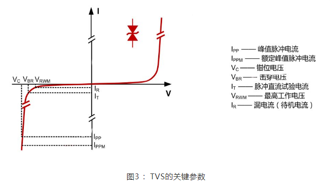 工欲善其事,必先利其器,要用好TVS,必須先了解其關(guān)鍵的參數(shù)。(1) Vrwm截止電壓:TVS 的最高工作電壓,可連續(xù)施加而不引起 TVS 劣化或損壞的最高工作峰值電壓或直流峰值電壓。對于交流電壓,用最高工作電壓有效值表示,在 V RWM 下,TVS 認為是不工作的,即是不導(dǎo)通的。換一句話,電路的最高工作電壓必須小于Vrwm,否則將會導(dǎo)致TVS動作導(dǎo)致電路異常。