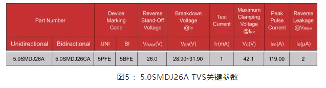 1) 選擇TVS最高工作電壓Vrmw≈1.1~1.2*VCC=26~28V2) 選擇選擇TVS鉗位電壓VC<Vmax=50V3) 計算實際測試波形功率:Pact=Vc**=50*(500/3)*1/2=4166W根據(jù)計算結(jié)果,可以選用5.0SMDJ26A這個TVS,由于這個TVS用在電源端口,結(jié)電容和漏電流基本可以忽略不計。