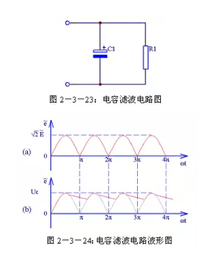(1)電容濾波電路電容濾波電路圖見圖2-3-23,電容濾波電路是利用電容的充放電原理達(dá)到濾波的作用。在脈動直流波形的上升段,電容C1充電,由于充電時間常數(shù)很小,所以充電速度很快;在脈動直流波形的下降段,電容C1放電,由于放電時間常數(shù)很大,所以放電速度很慢。在C1還沒有完全放電時再次開始進(jìn)行充電。這樣通過電容C1的反復(fù)充放電實(shí)現(xiàn)了濾波作用。濾波電容C1兩端的電壓波形見圖2-3-24(b)。