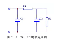 (3)RC濾波電路使用兩個電容和一個電阻組成RC濾波電路,又稱π型RC濾波電路。見圖2-3-27所示。這種濾波電路由于增加了一個電阻R1,使交流紋波都分擔(dān)在R1上。R1和C2越大濾波效果越好,但R1過大又會造成壓降過大,減小了輸出電壓。一般R1應(yīng)遠(yuǎn)小于R2。