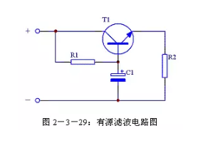 (5)有源濾波電路當(dāng)對濾波效果要求較高時,可以通過增加濾波電容的容量來提高濾波效果。但是受電容體積限制,又不可能無限制增大濾波電容的容量,這時可以使用有源濾波電路。其電路形式見圖2-3-29,其中電阻R1是三極管T1的基極偏流電阻,電容C1是三極管T1的基極濾波電容,電阻R2是負(fù)載。這個電路實(shí)際上是通過三極管T1的放大作用,將C1的容量放大β倍,即相當(dāng)于接入一個(β+1)C1的電容進(jìn)行濾波。