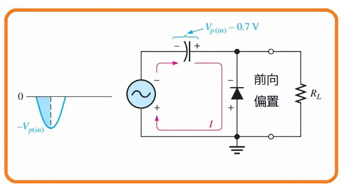 由于二極管電流的正向偏置通過負(fù)載電阻。由于該電流,電容被充電到具有相反極性(-V m )的輸入信號(hào)的極值,并且該電荷一直保持到該二極管處于正向偏置狀態(tài)。