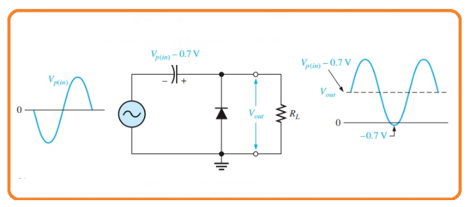 對(duì)于該電路的實(shí)際工作,假設(shè)波的負(fù)循環(huán)通過二極管。在信號(hào)二極管的負(fù)半部分處于正向偏置狀態(tài)期間,由于鉗位電路中的電容器充電至值 (Vp(in) – 0.7 V),如上圖所示。