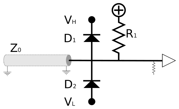 鉗位二極管不僅僅是為了改變電壓基線。它們在緩解瞬態(tài)事件方面非常有用,尤其是ESD和雷電浪涌。例如,當(dāng)輸入電壓高于 Vh 時(shí),D1 正向偏置。因此,過多的電流流過 D1 而不是負(fù)載。限流電阻器通常放置在二極管之前,以確保后者在限制范圍內(nèi)工作。
