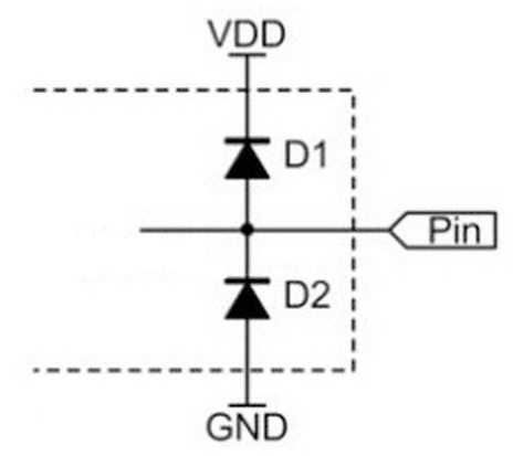 GPIO的電路配置:GPIO的參考電源VDD由鉗位二極管D1的陰極上拉,鉗位二極管D2的陽極接GND。