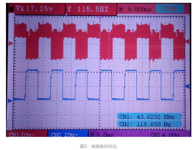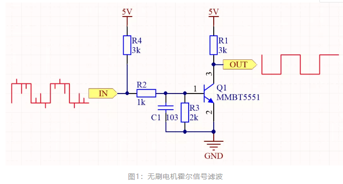 ?圖5是實(shí)測(cè)無(wú)刷電機(jī)霍爾信號(hào)經(jīng)過(guò)RC濾波后和三級(jí)管后濾波的波形對(duì)比,紅色波形代表霍爾信號(hào)經(jīng)過(guò)RC濾波后的,藍(lán)色波形代表霍爾信號(hào)經(jīng)過(guò)RC濾波再經(jīng)過(guò)三極管濾波后的;
