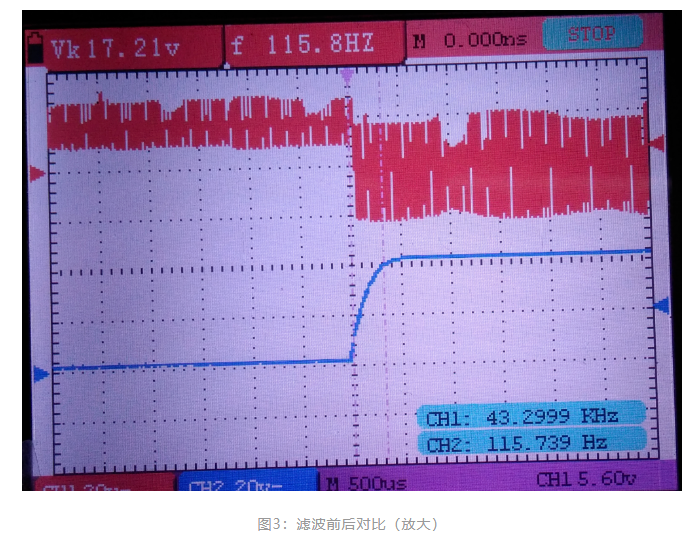 ?圖2、圖3、圖4是實(shí)測(cè)無(wú)刷電機(jī)霍爾信號(hào)濾波前后的波形對(duì)比,紅色波形代表霍爾信號(hào)濾波前的;藍(lán)色波形代表霍爾信號(hào)濾波后的。濾波前的毛刺異常恐怖。