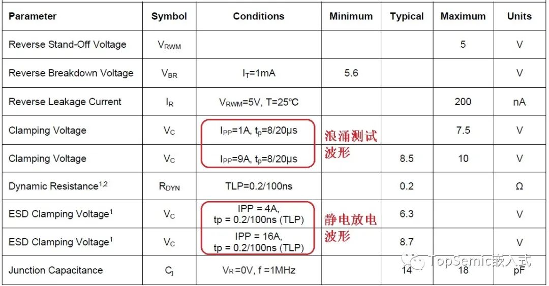 這里有爭(zhēng)議的可能是Vrwm,也就是截止電壓。如果工作電壓是5V,那么選TVS器件的時(shí)候可以選Vrwm=5V的器件嗎?我們的意見(jiàn)是可以選。理由是我們可以從特性曲線看到,即使工作電壓有波動(dòng)超過(guò)了5V,那漏電流仍然在可以接受的范圍內(nèi)。比如當(dāng)電壓波動(dòng)到5.6V,此時(shí)漏電流只有1mA。而且我們?cè)谝恍┕俜绞謨?cè)中,也可以找到例子。比如對(duì)于USB端口,電壓5V,就用到了Vrwm=5V的器件。