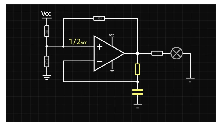 再來看這條路線,現(xiàn)在是接地0V,也就是變成下邊兩個(gè)電阻并聯(lián),那么這個(gè)點(diǎn)電壓變成1/3Vcc。同時(shí)電容通過這個(gè)電阻開始放電,電壓開始逐漸下降,一旦低于1/3Vcc,又再次變成同相比反向大,運(yùn)放再次輸出VCC電壓燈泡再次亮起,這整個(gè)過程就會(huì)一直自動(dòng)循環(huán)持續(xù)振蕩。這里的關(guān)鍵是調(diào)整電阻阻值,調(diào)整這個(gè)點(diǎn)的電壓,而電容容量決定了充放電是時(shí)間長短,也就是燈泡亮滅的時(shí)間間隔。