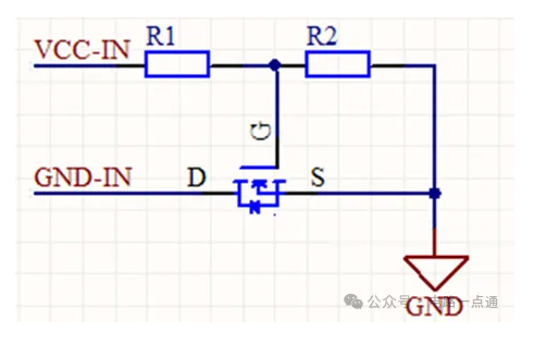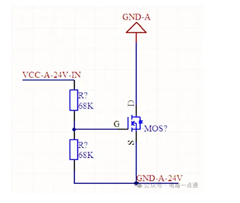 VCC-IN通過(guò)R1、R2 ,最后回到GND-IN;然后GS電壓升高,緊接著SD溝道形成,GND-A-24V便接在了GND-A上。