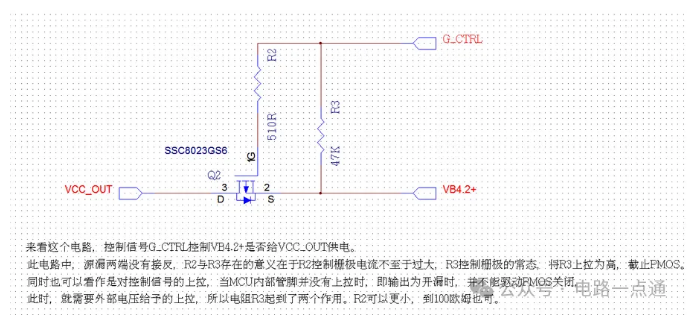 下圖這個(gè)電路,控制信號(hào)G_CTRL控制VB4.2+是否給VCC_OUT供電。此電路中,源漏兩端沒(méi)有接反,R2與R3存在的意義在于R2控制柵極電流不至于過(guò)大,R3控制柵極的常態(tài),將R3上拉為高,截止PMOS。同時(shí)也可以看作是對(duì)控制信號(hào)的上拉,當(dāng)MCU內(nèi)部管腳并沒(méi)有上拉時(shí),即輸出為開(kāi)漏時(shí),并不能驅(qū)動(dòng)PMOS關(guān)閉,此時(shí),就需要外部電壓給予的上拉,所以電阻R3起到了兩個(gè)作用。R2可以更小,到100歐姆也可。
