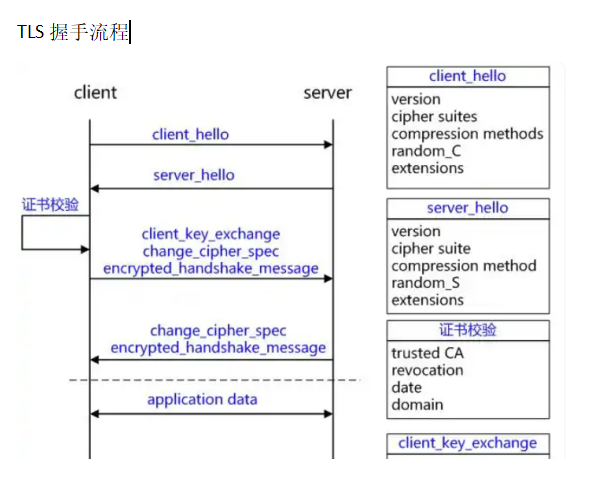 建立連接后先由客戶端發(fā)Client Hello信息,包含TLS協(xié)議版本信息、會(huì)話ID、支持的加密套件、用于計(jì)算秘鑰的隨機(jī)數(shù)等。服務(wù)器在能夠找到一組可接受的算法后,將響應(yīng)Client Hello消息并發(fā)送server hello,包括服務(wù)器版本、選擇的加密算法、密鑰交換算法、用于計(jì)算秘鑰的隨機(jī)數(shù)、MAC算法、根據(jù)客戶端會(huì)話參數(shù)生成的會(huì)話ID(用于會(huì)話恢復(fù))等。再協(xié)商好加密算法后服務(wù)器、客戶端驗(yàn)證證書,交換密鑰,建立連接。